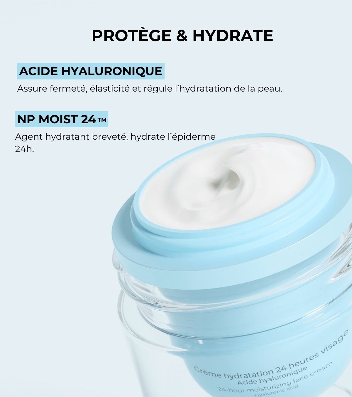 Entdecken Sie die 24-Stunden-Feuchtigkeitscreme, eine intensive Pflege, die dank der Kombination von zwei leistungsstarken Wirkstoffen - NP MOIST 24™ und Hyaluronsäure - extreme Feuchtigkeit spendet, die Haut aufpolstert und 24 Stunden lang schützt. Ihre schmelzende Textur wird schnell absorbiert und hinterlässt die Haut angenehm, geschmeidig und strahlend. Mit 92 % natürlichen Inhaltsstoffen ist diese Creme nachfüllbar, was eine Reduzierung des Kunststoffverbrauchs um 78 %* ermöglicht.