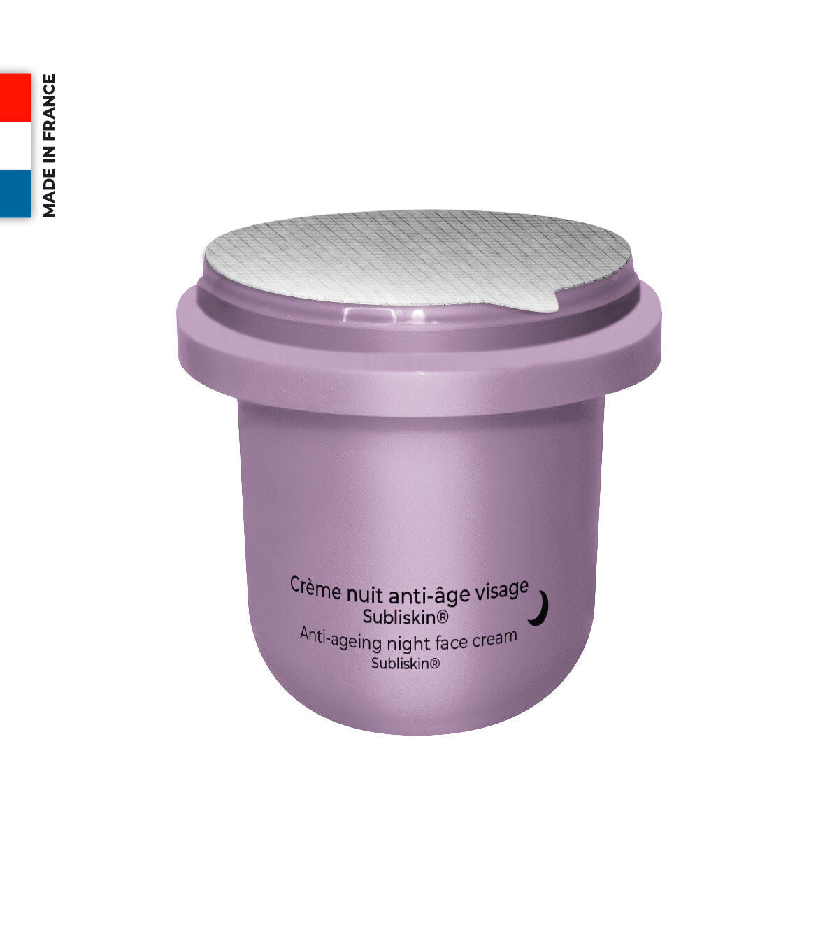 Die Globale Anti-Aging-Nachtcreme, hergestellt in Frankreich mit 92 % natürlichen Inhaltsstoffen, verleiht Ihrer Haut beim Aufwachen ein glattes und jugendlich strahlendes Aussehen. Ihre innovative Formel, angereichert mit Subliskin®, einem patentierten Wirkstoff, steigert die Feuchtigkeitsversorgung, glättet die Haut und sorgt für optimalen Komfort. Mit Sheabutter angereichert, hüllt diese Creme Ihr Gesicht in seidige Weichheit. Nacht für Nacht verblassen Anzeichen von Müdigkeit, und die Haut erscheint sichtbar glatter, fester und aufgepolstert. Dermatologisch getestet.