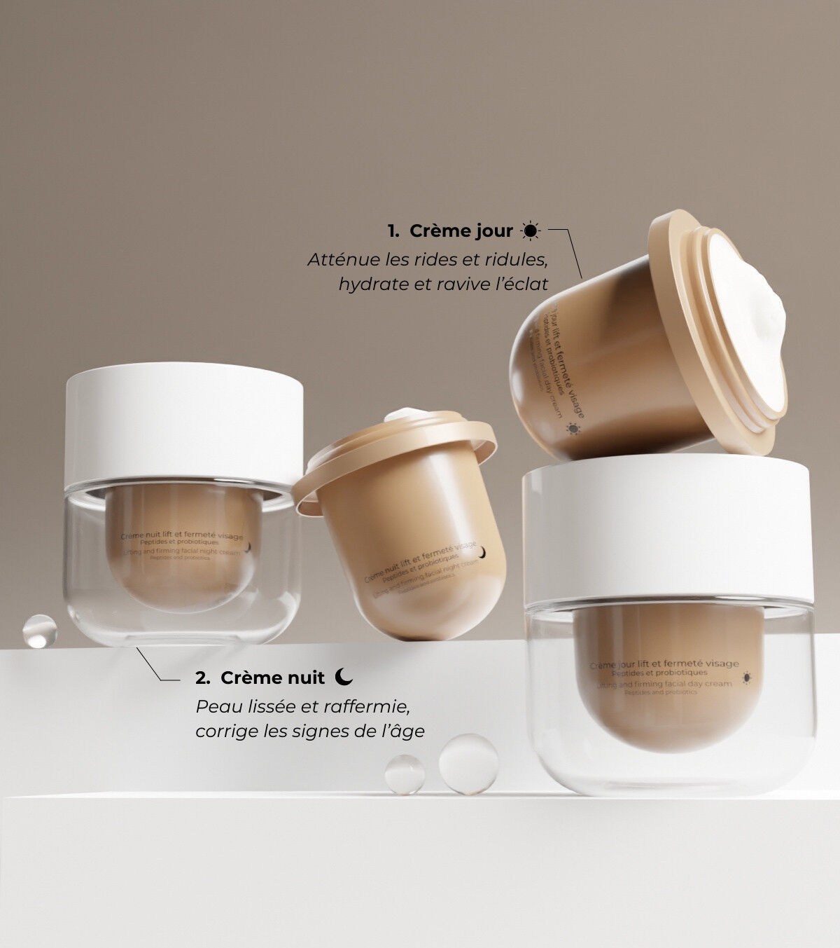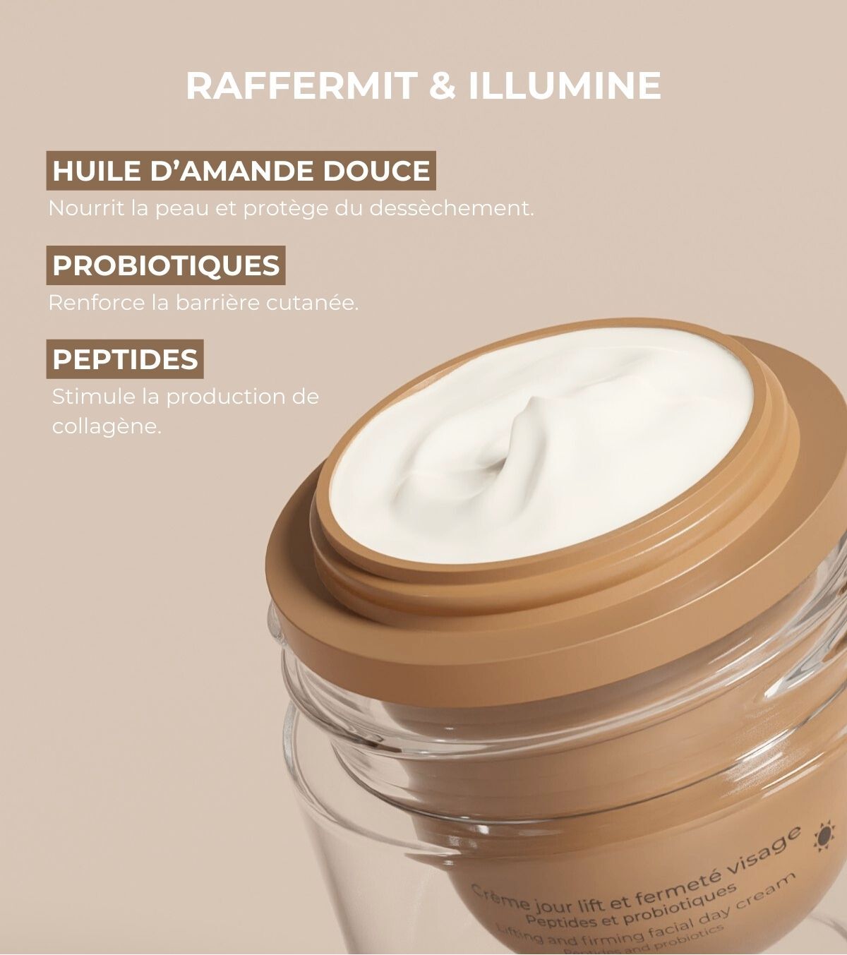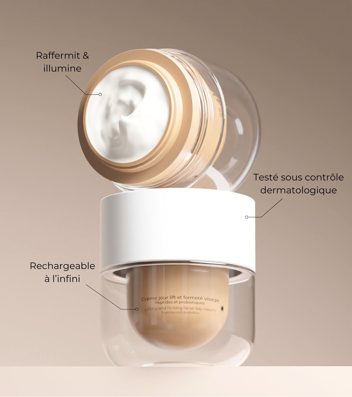 Diese straffende Tagescreme begeistert durch ihre cremige Textur. Sie strafft die Haut, glättet und mildert feine Mimikfältchen und Falten, verleiht der Haut neue Elastizität und Geschmeidigkeit, spendet ihr Feuchtigkeit, sorgt für einen ebenmäßigen Teint und lässt die Haut von innen heraus strahlen. Diese mit Peptiden und Probiotika versetze, dermatologisch getestete Tagescreme wirkt den Zeichen der Hautalterung entgegen. Tag für Tag wird die Haut so sichtbar verschönert.